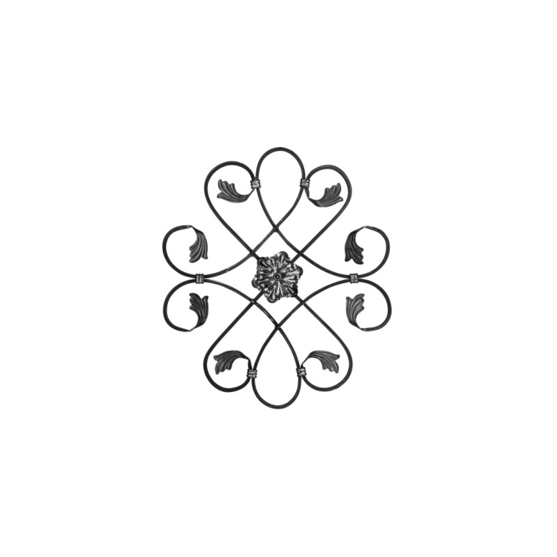 Stalowa rozeta wykonana z płaskownika, wykończona ozdobami w kształcie liści oraz kwiatkiem na środku elementu. Rozetę można wykorzystać w ogrodzeniach, balustradach, bramach, furtkach czy kratach. Produkt w stanie surowym, do wykończenia we własnym zakresie.