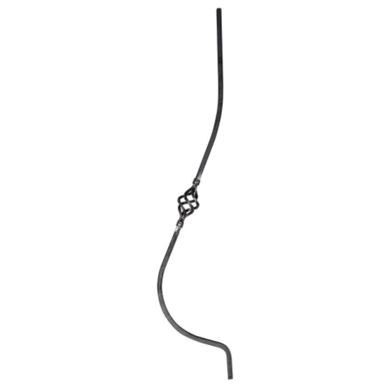 Stalowy element kuty - tralka z wybrzuszeniem, posiadająca w środkowej części element ozdobny - koszyk, wykonana z pręta kwadratowego 12x12 mm. Tralki tego typu można wykorzystać do projektowania balustrad balkonowych i tarasowych, jak również ogrodzeń, krat czy furtek. Produkt w stanie surowym, do wykończenia we własnym zakresie.
