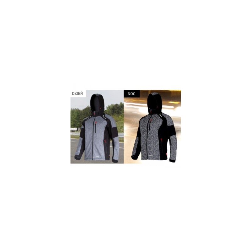 Materiał z nadrukiem odblaskowym zwiększający widoczność po zmroku. 5 kieszeni (3 zewnętrzne zamykane na suwak i 2 wewnętrzne). Odpinany kaptur z regulacją szerokości. Zamek błyskawiczny.