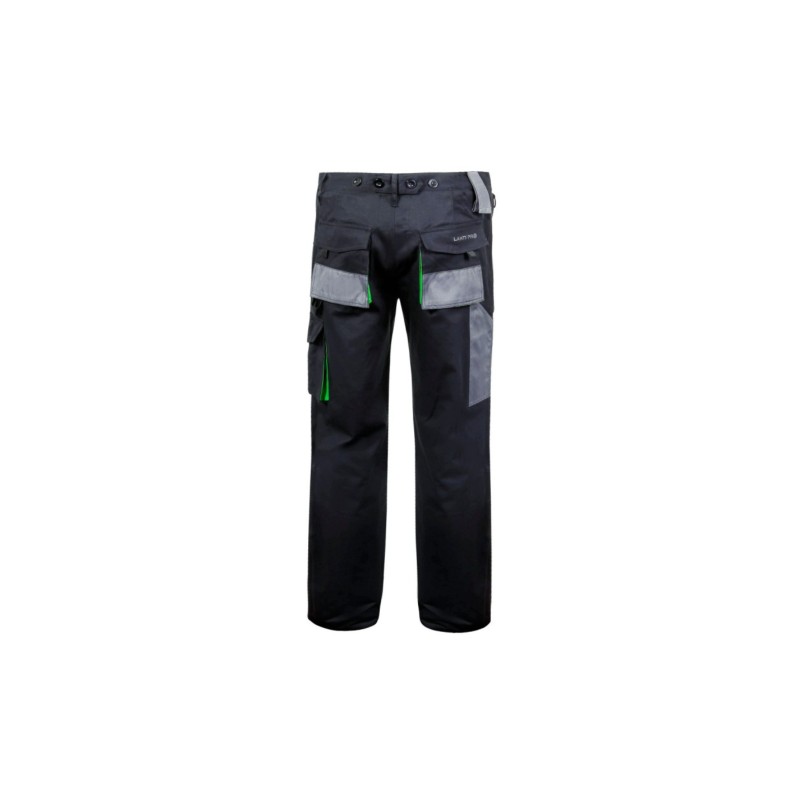 9 kieszeni, w tym 6 zapinanych na rzep. Kieszeń na telefon komórkowy. Potrójne szwy. Regulacja szerokości w pasie za pomocą guzików.