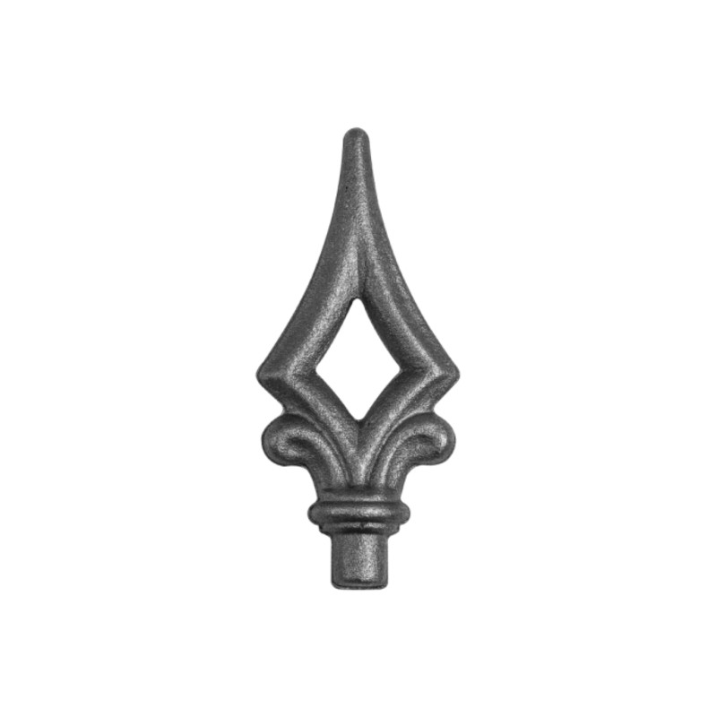 Stalowy element kuty - grot wykorzystywany najczęściej jako zwieńczenie prętów lub profili w bramach, furtkach i przęsłach ogrodowych. Może być również pomocny w ozdabianiu wnętrz i w projektowaniu architektury ogrodowej. Produkt w stanie surowym, do wykończenia we własnym zakresie.