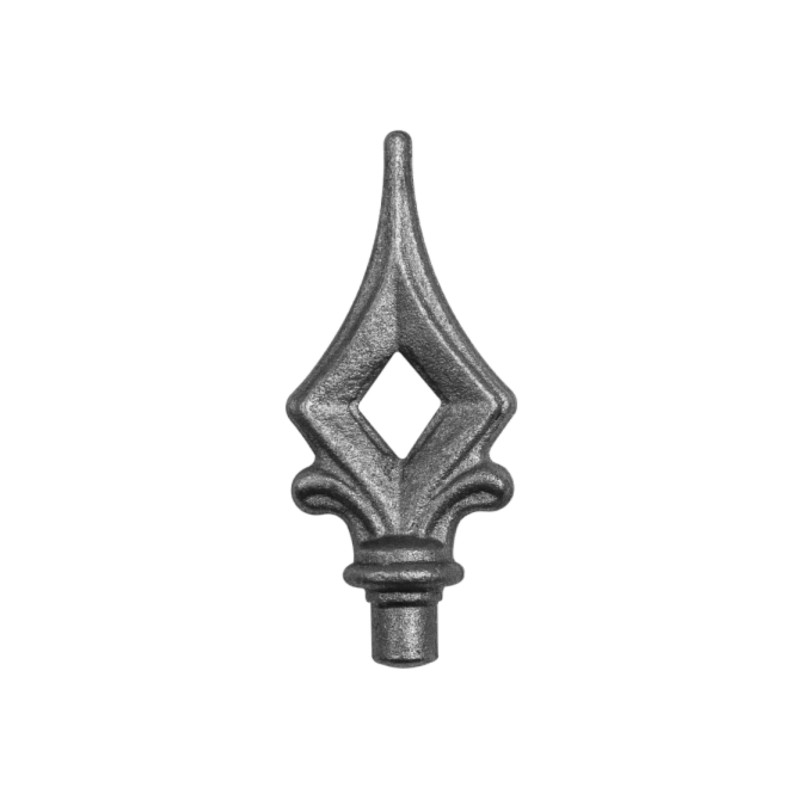 Stalowy element kuty - grot wykorzystywany najczęściej jako zwieńczenie prętów lub profili w bramach, furtkach i przęsłach ogrodowych. Może być również pomocny w ozdabianiu wnętrz i w projektowaniu architektury ogrodowej. Produkt w stanie surowym, do wykończenia we własnym zakresie.