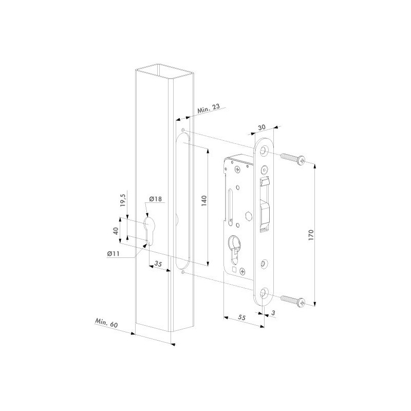 Zamek wpuszczany ze stali nierdzewnej do zamykania (automatycznych) bram przesuwnych.