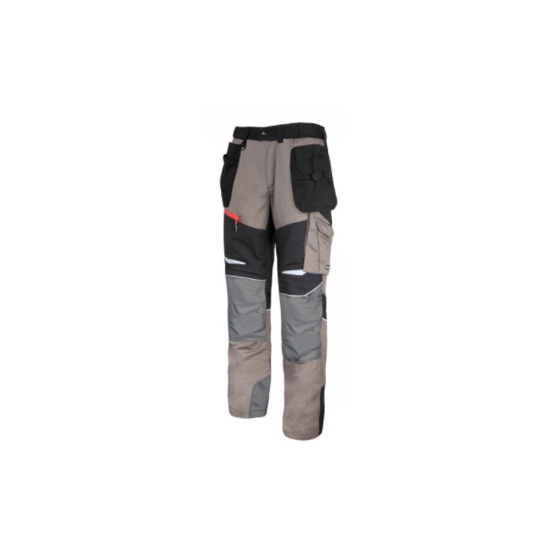 Oczko na klucze, szlufka na młotek, 3 uchwyty na miarkę, szlufki na pasek. Wzmocnione kieszenie, kieszenie na ochraniacze kolan oraz dół spodni materiałem (5000 poliester) odpornym na przetarcia.