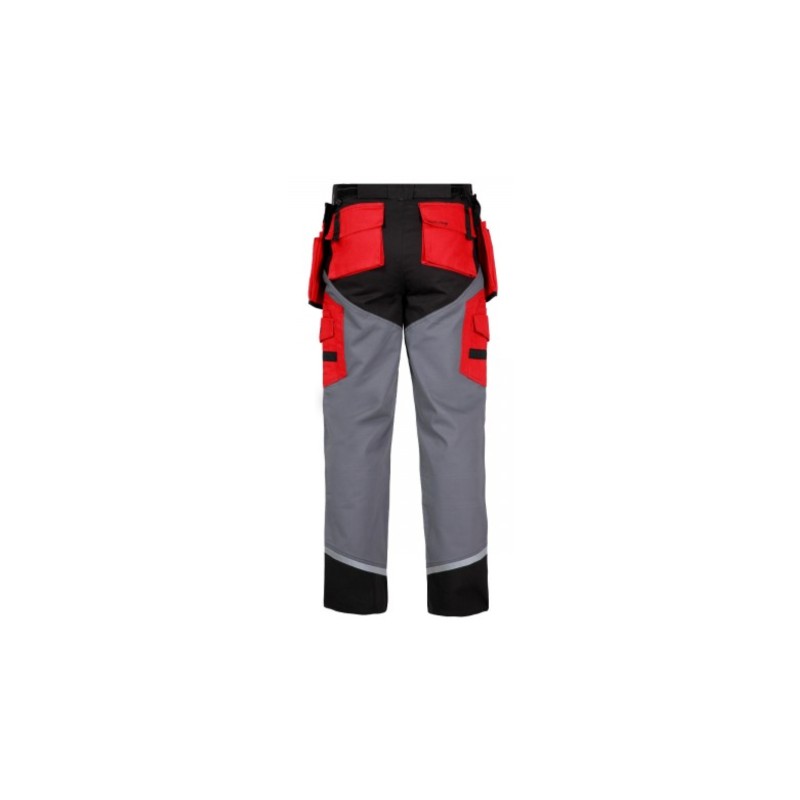 Oczko na klucze, 2 szlufki na młotek, 2 uchwyty na miarkę, kieszenie na ochraniacze kolan.