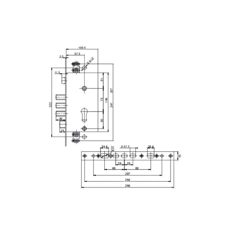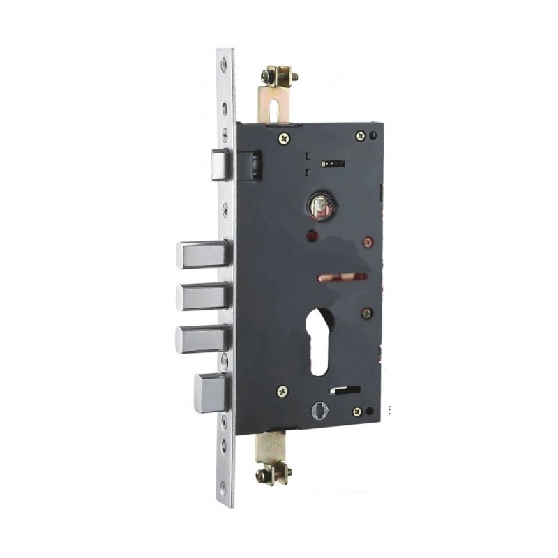 Zamek do drzwi chińskich. Montowany jako zamek główny, posiada cięgna do sterowania ryglami pionowymi. Posiada 3 rygle + 1 zamykany pokrętłem od wewnątrz.